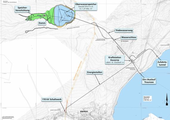Das Kraftwerk ist als Kavernenkraftwerk am Fuße des großen Sonnsteins mit einer reversiblen Pumpturbine geplant. Der Oberwasserspeicher befindet sich im Rumitzgraben. Den Abschluss des Speichers bildet ein ca. 60 Meter hoher Naturschüttdamm. Als Unterwasserspeicher dient der Traunsee. Das Wasser wird über eine Pumpturbine rund 490 Meter nach oben gepumpt und bei Energiebedarf wird das gespeicherte Wasser über die Pumpturbine nach unten geführt und Strom erzeugt.