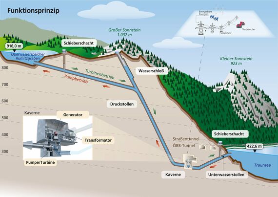 Sonnstein with a reversible pump turbine. The upper water reservoir is located in the Rumitzgraben. The completion of the reservoir is formed by an approximately 60-meter-high natural embankment dam. The Traunsee serves as the lower water reservoir. The water is pumped up about 490 meters using a pump turbine, and when energy is needed, the stored water is led down through the pump turbine to generate electricity.